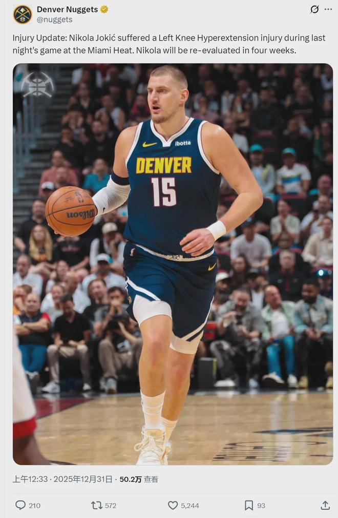 北京时间12月31日凌晨,掘金官方宣布约基奇左膝过度伸直,将在4周后重新接受检查。幸运的是,约基奇的十字韧带没有受伤。这一个月的缺席将是约基奇NBA生涯最长的缺席。他此前打了69场比赛,是单赛季最少的。掘金首发阵容中约基奇(左膝过伸)、戈登(右腿筋拉伤)、布朗(左脚踝严重扭伤)和卡梅隆·约翰逊(右膝挫伤)等四名球员受伤,短期内无法复出。掘金队的替补席上没有人,所以如果他继续打球,他可能不得不签下一份10天的短期合同。目前掘金队以22胜10负的战绩排名西部第三,落后第二名马刺队1个胜场,落后第四名火箭队1个胜场,落后第七名太阳队3个胜场。纳格人ET正在进行七场东部客场之旅,还剩下五场比赛,对阵猛龙队、骑士队、篮网队、76人队和凯尔特人队。约基奇至少会缺席到1月28日,届时掘金队将打16场比赛。球员必须出战至少65场比赛并缺席最多17场比赛才能入选常规赛MVP和最佳阵容。约基奇的获奖资格尚待确定。本赛季至今约基奇出战32场比赛,场均出场34.6分钟,得到29.6分12.2篮板11助攻1.4抢断0.8盖帽和3.5次失误。他的三分球命中率分别为60.5%、43.5%和85.3%。约基奇场均得分排名联盟第五,篮板和助攻排名联盟第一。聪明得分、二次进攻得分、两双和三双次数、比赛贡献率和助攻率等统计数据均排名联盟第一。当约基奇在场时,掘金每100回合得分比他不在场时多17.3分。约基奇的重要性在于明显。 NBA知名记者沙姆斯在节目中补充道,约基奇不仅膝盖过度伸展,而且还有骨挫伤。运动医学专家布莱恩·萨特勒表示,根据以往的病例,约基的康复应该需要六周的时间,更现实的回归日期将是全明星赛之后(2026年2月15日)。最后祝月老师早日康复!您认为掘金队下个月的表现如何?