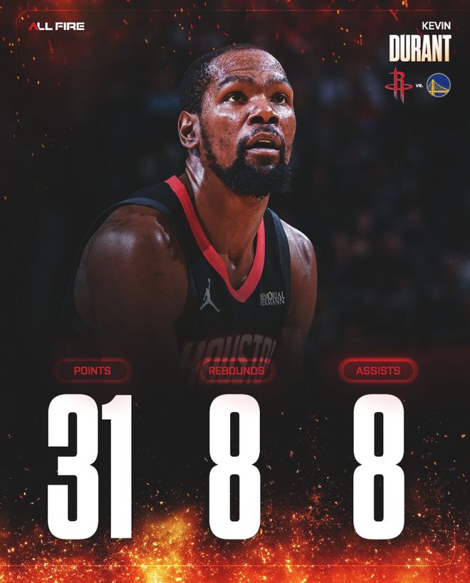 在对阵勇士队的比赛中,凯文·杜兰特出战37分钟,17投10中,三分球6中3,罚球9中8,得到31分8篮板8助攻3盖帽,投篮命中率58.8%,三分命中率50%。第四节,杜兰特投进了一生三分,半决赛还剩11.1秒时,凭借杜兰特的篮下传球,悄然取得了胜利。本场比赛过后,火箭队已经取得六连胜,落后西部第三的湖人队一场胜利。湖人队近期因为东契奇和里维斯的伤病,遭遇两连败。火箭队和掘金队都希望超越湖人队,排名西部第五。记者布拉多写道:我从来没有想过有一天杜兰特会穿着火箭队的球衣与斯蒂芬库里竞争。本场比赛结束后,杜兰特近10个赛季第28次得分30分以上。也就是说,37岁的他堪比27岁的-老的。主办方媒体Will也报道称,本场比赛杜兰特依然面临德雷蒙德·格林的强硬防守,他的很多防守动作并不典型。赛后,库里也称赞杜兰特保持了极强的竞争力。他很高兴我们能在职业生涯的这个阶段保持这样的水平。这真的很疯狂。 KD本赛季出场次数达到28次30+,位居联盟第二,但这对于这位37岁的老将来说并不是一件小事。媒体支持杜兰特入选本赛季最佳阵容,因为许多超级巨星由于65场比赛的规则将没有资格获得该奖项。杜兰特不仅带领火箭队进入西部季后赛,他场均贡献27分、6个篮板和5次助攻,投篮命中率高达51%,三分球命中率为41%,罚球命中率为88%。他的防守也非常出色。杜兰特现在有资格接受评估。他出场 75 场比赛。 KD今年一直保持健康季节。 uduka他场均失球36.3分钟(联盟第三),但他上篮的次数却没有那么多。 KD会入选最佳阵容吗?